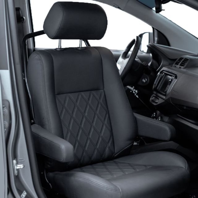 O banco gira mecanicamente em torno de 90° e se encaixa em uma base que transforma em uma cadeira de rodas. O banco possui dupla função, sendo utilizado no veículo ou como uma cadeira de rodas.